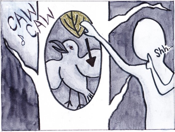 "Caw caw!" Hansel and Gretel approach the shrieking crows perched on the trees and scare them back into their nests.