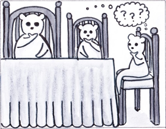 Papa, Mama, and Baby Bear sit in their chairs-which fit them each perfectly-to figure out what to do.