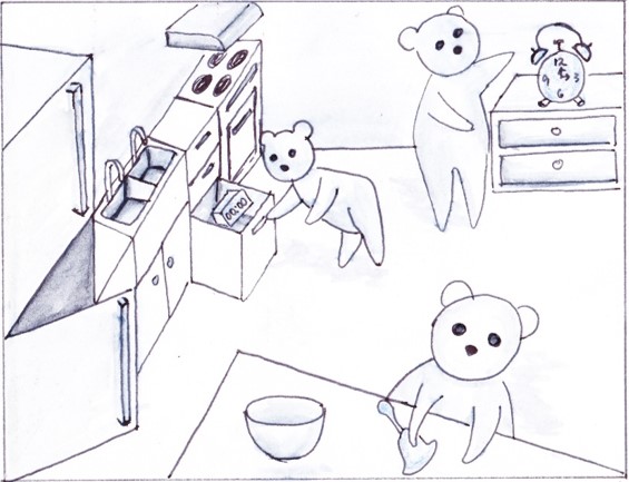 What can they use to frighten the stranger away? Aha! They grab the alarm clock, kitchen timer, and dinner bell.
