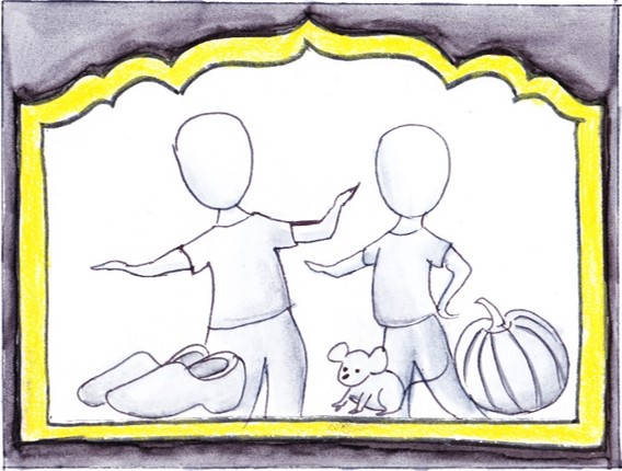 In the mirror, they see their sorrowful selves in tattered clothes, with a pumpkin, mice, and clogs scattered about.