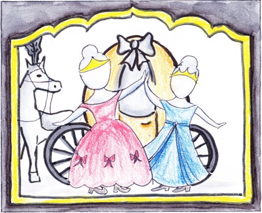 The mirror now reflects an elegantly dressed party standing before a carriage, horses, and glass slippers--they are ready for the ball!