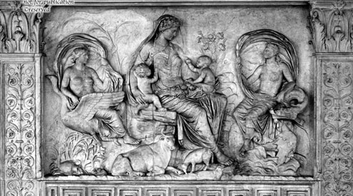 Children are also found in the depiction of the mythical tale of Romulus and Remus being nursed by a she-wolf on the western wall. This very familiar and popular motif undoubtedly resonated with those who viewed the altar. Augustus promoted solid family mores by encouraging upper-class families to have children. Population growth was the key to future Roman imperium. This is represented by large number of children represented on such a monument, and reinforced by having children present in the Tellus panel representing fertility.