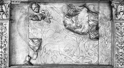 This detailed panel of Aeneas shows him wearing the laurels wreath which is a classical symbol of Julius Caesar.