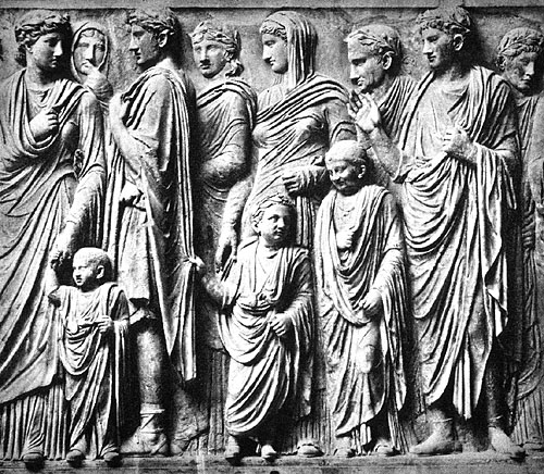 Children are featured very prominently throughout the relief on the Ara Pacis. In the depictions of the imperial and senatorial families attending a religious ceremony, children are depicted tugging at their mother's dress. They wiggle and squirm, visually uncomfortable. The universal theme of children growing anxious and restless through religious functions, unfounded prior to the construction of the Ara Pacis, held great appeal and would be widely imitated in middle-class funerary artwork soon after (Galinsky 150). By depicting children as well as women, the Altar has an informal and humanistic side not found in the rigidly formal and militaristic friezes found on other monuments. Although the original faces have been lost, the faces of the those depicted all have soft expressions, like real people. The people depicted have flaws, even needing to be silenced by one attendee for talking too loudly.