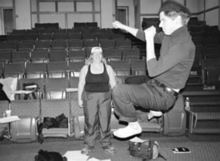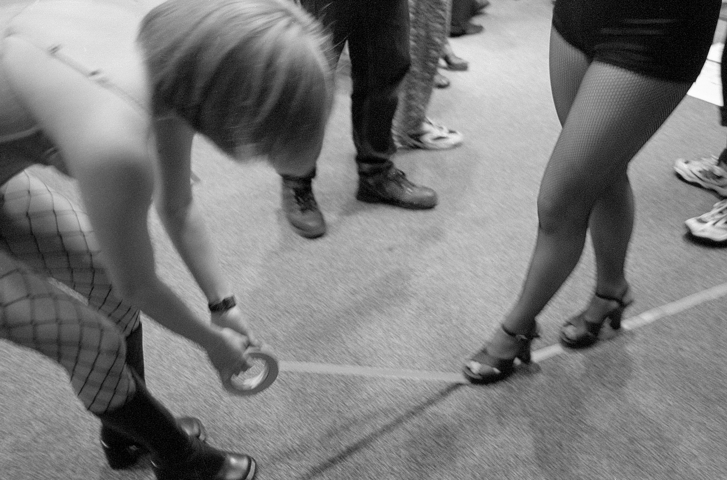 Charlene and Emily tape the floor to mark the stage boundary. |