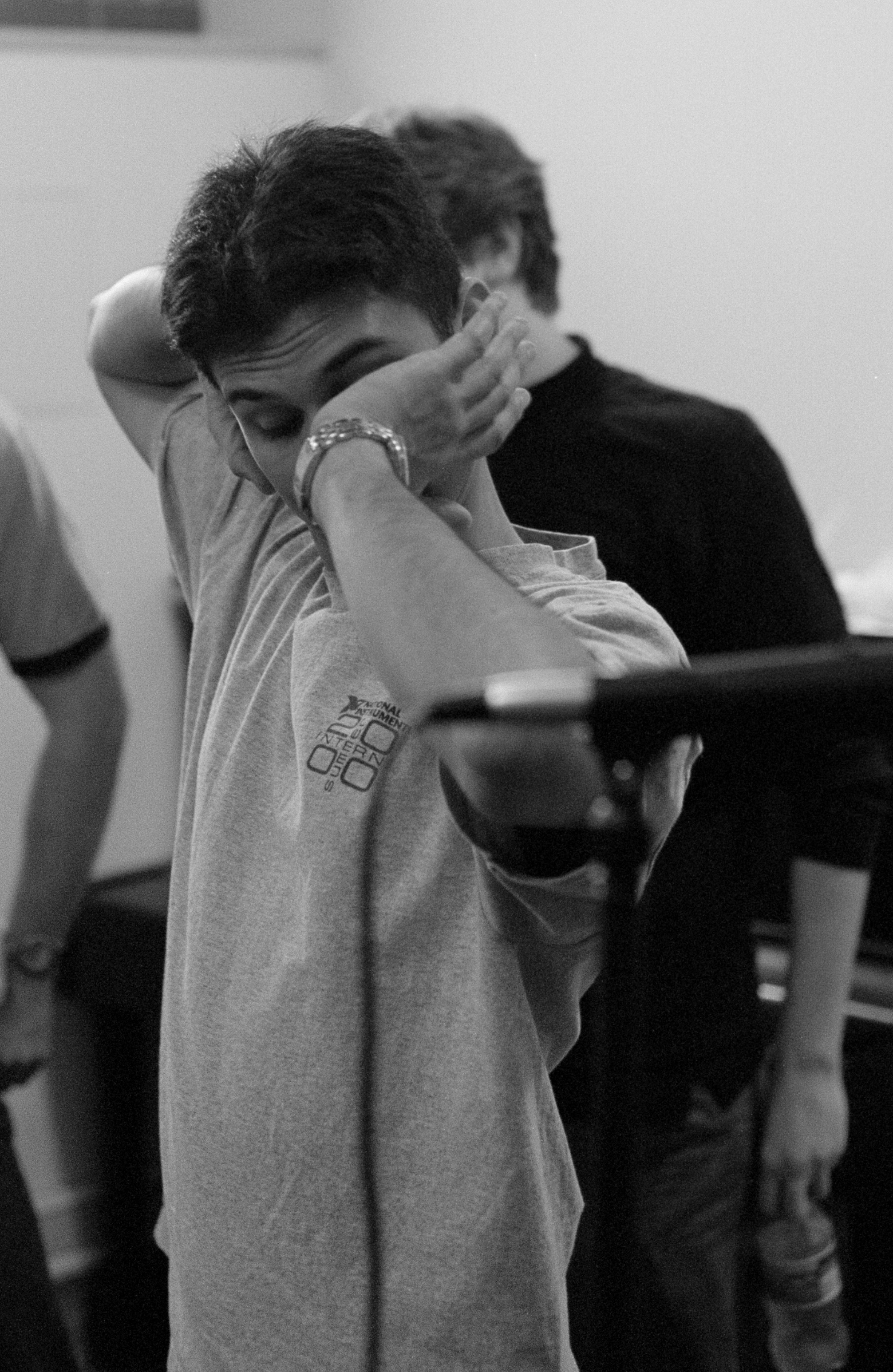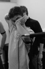 Emily tries to focus the group during warmups... |