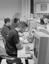 Charlene and Lisa work on Bad Taste skits in the Athena Cluster. |