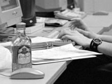 A bottle of whisky tempts Maggie as she works. |