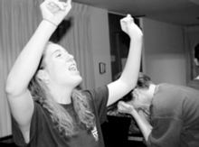 Amy watches Dan vent some agression. |