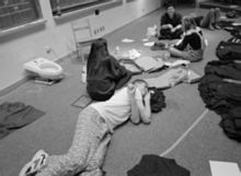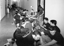Fans wait in the hall outside 10-250 on the morning of the concert. |