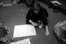 Dan looks at the skit list and makes cue cards. |