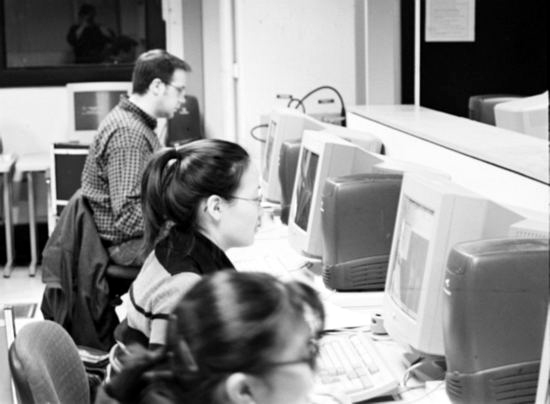 Charlene and Lisa work on Bad Taste skits in the Athena Cluster.