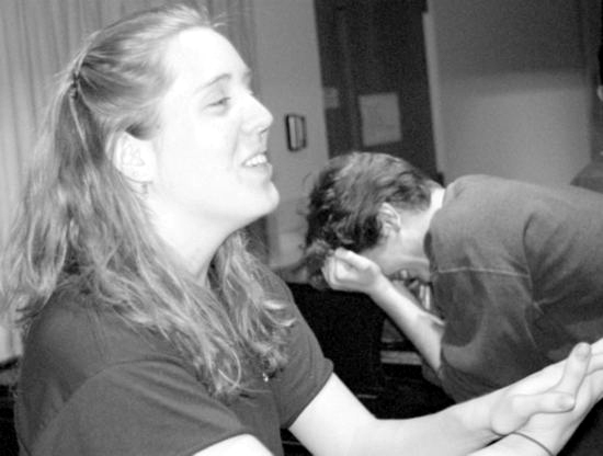 Emily tries to focus the group during warmups...