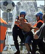 La foto abaja muestra un fanático alemán que era arrestado antes de un juego. La violencia asociada con el fútbol, especialmente con la copa mundial, es una mancha del juego. Para más