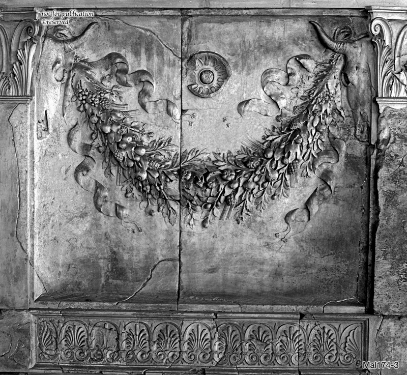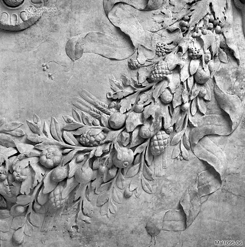 Detail view of the Acanthus garlands containing fruits from all the seasons.