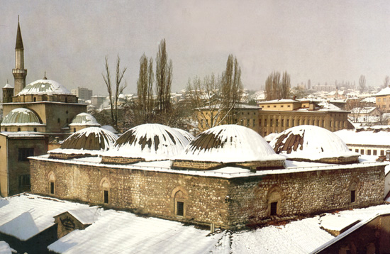 Bursa Besistan (indoor market) and Gazi Husref Bey Mosque - XVth century. Source: Kalkan, I. at alii "Sarajevo: Project for the Protection of Human Environment". Forum, Novi Sad, 1982.