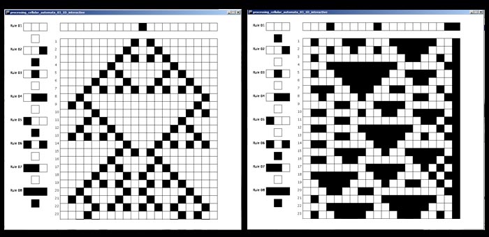 Cellular Automata Example (Linear Pattern)4.564 | Tutorials and Samples (Processing)write requests to: takehiko@mit.edu original: 2002.09.02.02 last revised : 2013.05.05 |