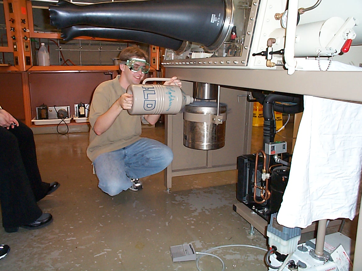 Picture 2: Dave (5.33 TA) is filling the Dewar of the Glove Box cold well with nitrogen.