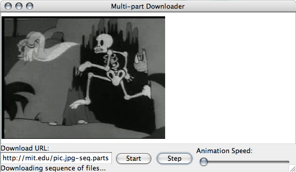 The GUI offers a text field and an adjacent button marked Start. The user enters a URL in the text field pointing to a manifest stream (which may be local or on another machine) and clicks on the button. The application then downloads the stream part-by-part. If the stream results in a single finite file, the file is downloaded in its entirety and then displayed in the window. The GUI also supports (potentially endless) file-sequence streams, described below. Each file in these sequences is downloaded and displayed in succession, creating, for example, an image animation or textual progression. The Step button downloads and displays the next file in a sequence stream, and the Animate slider controls automatic stepping, for example to watch an animated sequence of image files.