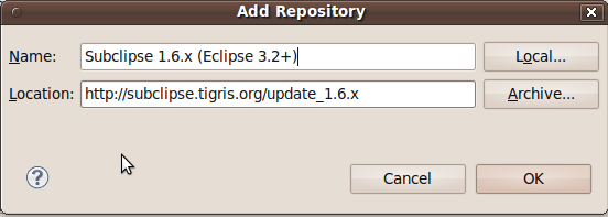 An Add Repository dialogue will appear, type in "Subclipse 1.6.x (Eclipse 3.2+)" for Name and http://subclipse.tigris.org/update_1.6.x for Location.