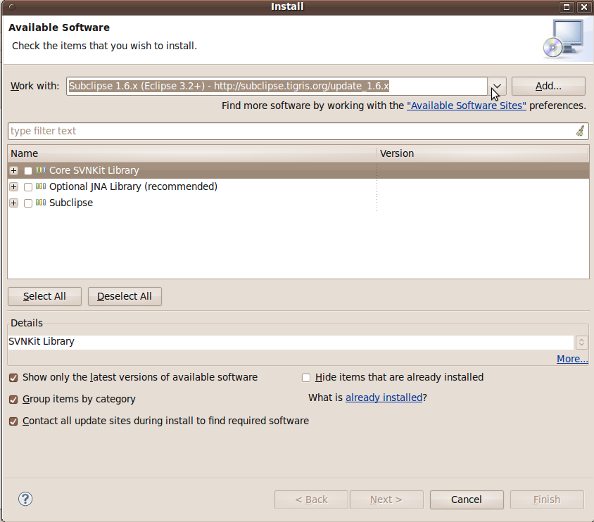 Select all three bundles of software (Core SVNKit Library, Optional JNA Library, and Subclipse) and then click next.
