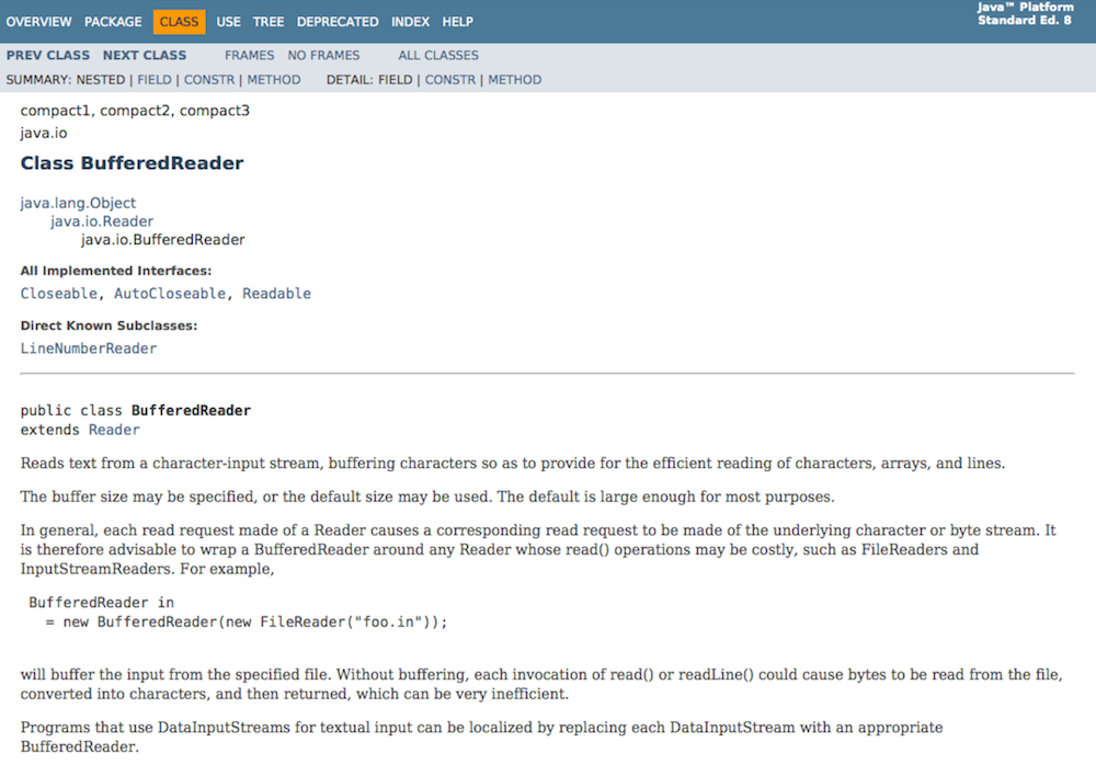 Let's take a closer look at the documentation for [`BufferedReader`](java:java/io/BufferedReader).