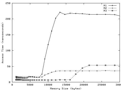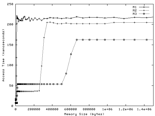 As an example, the plot for M1 has a point at X=21,504 and Y=215. This means that when latency looped over an array of 21,504 bytes, the completion time for loads from the array averaged 215 nanoseconds.