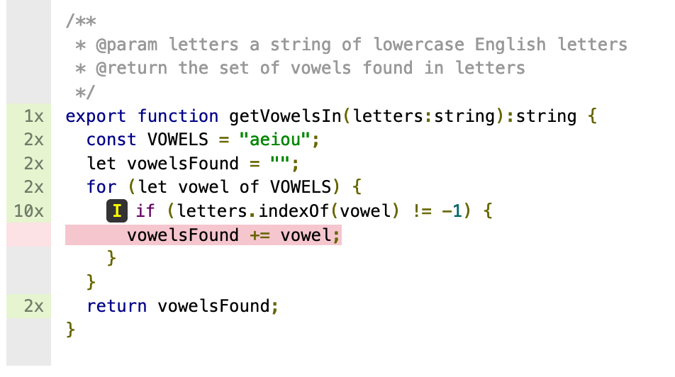 Suppose you have just one test case for this function, which only calls getVowelsIn("aeiou").