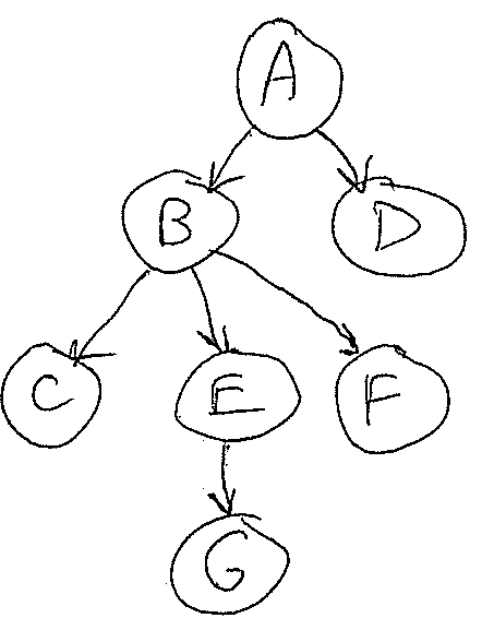 The root of this entire tree is the node labeled A, which has children B and D. B in turn has children C, E, and F, and E has one child, G. The nodes C, G, F, and D are leaves, because they have no children.