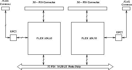 The FPGA module consists of two of Altera's FLEX 10K PLDs, one FLEX 10K10 and one FLEX 10K70, which can be accessed through the lab kit's NuBus interface and 50-pin ribbon cable connectors. The state of the NuBus interconnects can be continuously displayed on the lab kit's hex leds by connecting jumpers /LHEX and /HHEX to /CLK (or any other clock). Also, the Proto strip connection labeled NUHEX must be grounded.