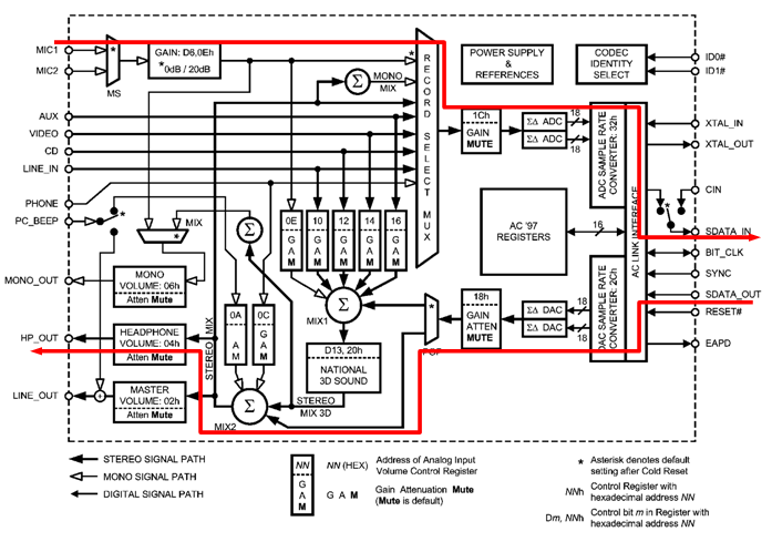 Our labkit is equipped with an AC97 Audio Codec chip (a National Semiconductor LM4550) which serves as an interface between the analog world of traditional audio components (e.g., headphones and microphones) and the digital world of the FPGA. The block diagram of the LM4550 shown below has been marked up to show the processing paths we'll be using for this lab:
