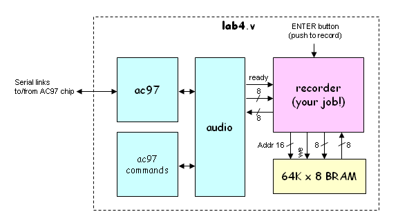 lab4: a modified version of labkit.v that includes instances of the audio and recorder modules, hooking them up appropriately to each other and the pins connecting to the AC97 codec. The labkit's ENTER pushbutton is used as the record/playback button (push to record). You shouldn't need to modify this module.