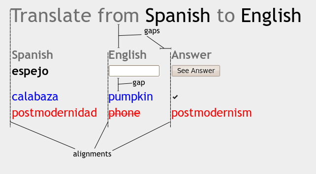 - A three-column layout should be used in order to align the row containing the labels ("Spanish", "English", "Answer"). One row containing the current entry ("espejo", an <input> element, and the See Answer button). The other rows containing the past entries (bottom).