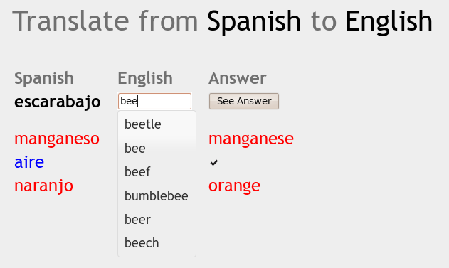 - Pressing enter prompts for another word, clears the <input>, returns focus to the <input>, checks to see if the answer is correct, and populates the list of previous answers accordingly (should have the same behavior as clicking on the See Answer button and selecting an autocomplete suggestion)