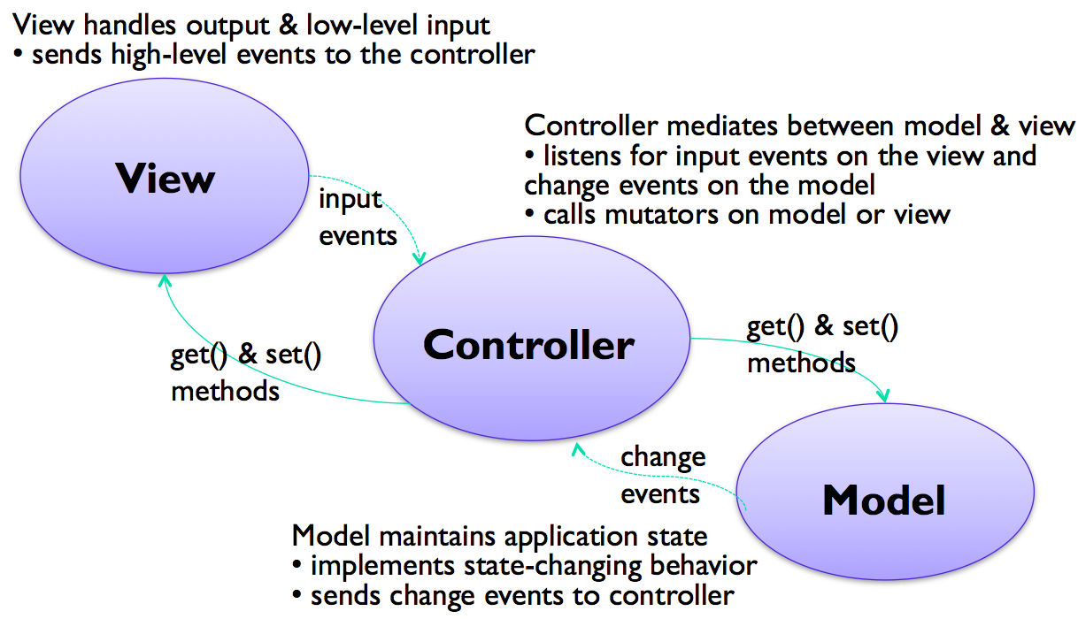 Finally, the controller handles the input. It receives keyboard and mouse events, and instructs the model to change accordingly.