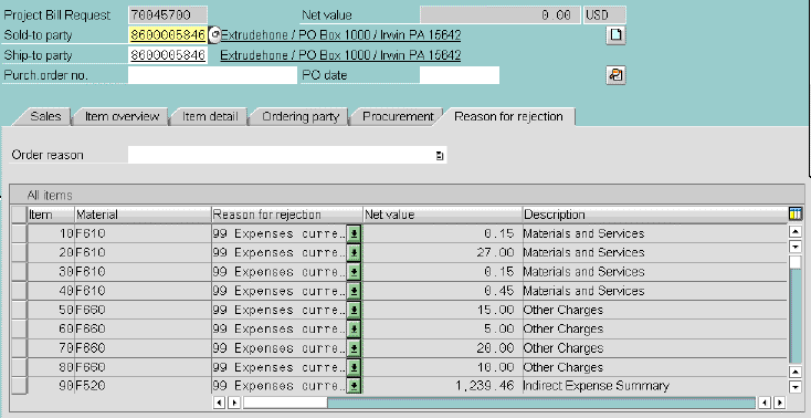Result: The reason for rejection displays on the overview screen, as shown below. The Net value (at upper right, as shown below) should now equal 00.0.