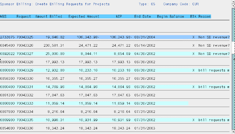 | X is not billing what we expect | The Amount Billed is not equal to the Expected Amount. The project cannot be billed until the problem is researched and the billing block removed using V.23. |
