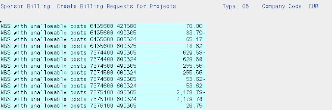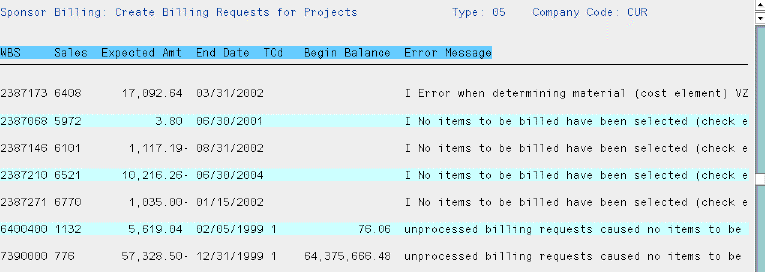 This report section lists other errors that prevent billing requests from being created. Some reasons are the same as reported in ZPSR001C - Validate Sale Orders. The current program also reports on unallowable costs.