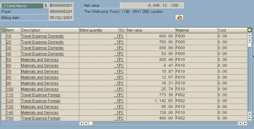 Result: Unless errors are found, the selected billing requests are processed into bills that are automatically posted to FI as invoices to the customer (sponsor). A billing log displays, as shown below. Any errors are listed in the last column.