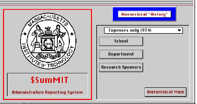Hierarchical ReportsThe $SumMIT hierarchical reports are preprogrammed reports that run on current or historical accounts data. Current data includes FYTD actuals and budgets for the current and prior fiscal years. Historical data is fiscal year-end data back to 1978. You can select to display expenses only (object code 974) or expenses net of income (object codes 145 and/or 199). You can run hierarchical reports by school, dept, and research sponsor (and with current data, on your authorized accounts). The reports summarize data for ALL accounts at the Institute (except at the accounts level, where data is for your authorized accounts only). For example, the School report shows current or historical data by school. From within a higher level report, you can "drill down" further - for example, run the department report for a specific school. As of v4.19, you can "dig down" past data by sponsor group to view data for individual sponsors. |
