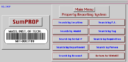 With SumProp, you can search the property database on MITVMA from your workstation and display and print data on departmental property items. Quick searches you can perform in SumProp are described on the main menu (shown above) and the Quick Searches pulldown menu (which also includes searches by standard item name, manufacturer, and research contract number). For example, you can click on the Search by Person button above to display a list of items for a responsible person. With quick searches, you display and print complete detail for items individually. To display and print complete property detail in batch mode, you can run batch reports. |