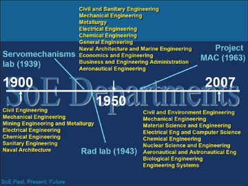 As an historical comparison, the School now has a biological engineering division (soon to become a department), an engineering systems division, and a department of nuclear science and engineering, none of which existed in 1950. Moreover, the content of most departments has changed significantly as illustrated by the fact that only two departments today (chemical and mechanical engineering) have the same names as those in 1950. And even though chemical engineering and mechanical engineering have the same names, their content is quite different. In 1950, chemical engineering focused quite heavily on petroleum engineering, as contrasted to today, with more emphasis on topics like molecular engineering. And part of today's mechanical engineering footprint, with topics like quantum computing, nanotechnology, and optics, would hardly have been recognized in 1950. Electrical engineering in 1950 concentrated on both small-scale transistors and large-scale computers, which were merging and evolving rapidly. Universities do change! (An interesting aside: we can however see precursors of our two divisions in Dean of Engineering Gordon Brown's essay of 1967 in which he argued for the creation of two activities: engineering living systems, now known as bioengineering, and a new urban systems laboratory, that is, a major systems-based activity.)