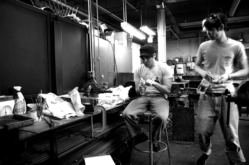 Over hot glass or during food or water breaks the glassblowers in the lab talk about glass. Whether it is a new technique recently learned, a new glass tool recently purchased, or just plain gossip about gaffers within or outside of the Glass Lab: glass is on the mind.