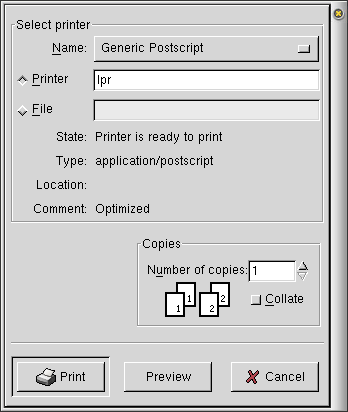The printer selection window, shown in Figure 8-2, lets you choose the format for printing— Generic Postscript, whether to write to a PDF file, and whether to print to a file or to an actual printer in Generic Postscript. If you choose a printer, you'll be asked for the printer command (probably lpr) which your system uses. If you choose to print to a file, you'll need to decide upon a filename. And of course, you'll want to choose a number of copies, and whether to collate them.