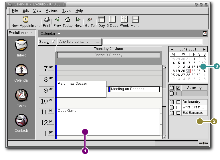 The Todo List compliments the Event List as it keeps track of your chores or tasks which don't have any time associated with them. These may include "Clean Room" or "Call Repairman".