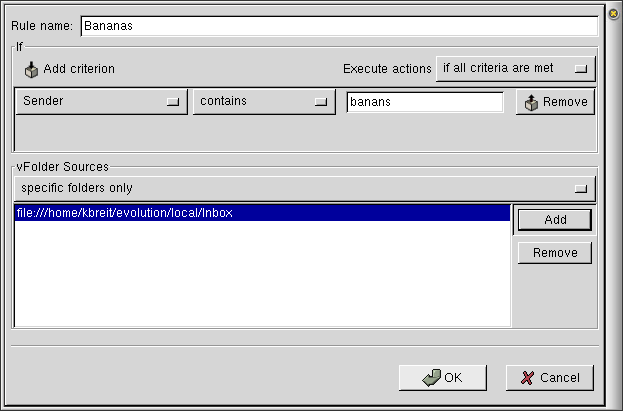 To organize his mailbox, Jim sets up a virtual volder for emails from his friend and co-worker Anna. He has another one for messages that have ximian.com in the address and Evolution in the subject line, so he can keep a record of what people from work send him about evolution. If Anna sends him a message about anything other than Evolution, it only shows up in the "Anna" folder. When Anna sends him mail about the user interface for evolution, he can see that message both in the "Anna" virtual folder and in the "Internal Evolution Discussion" virtual folder.