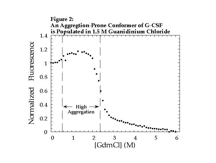 Equilibrium denaturation of G-CSF demonstrates that a highly fluorescent, aggregation-prone state is populated in 1.5 M GdmCl (Fig. 2). Fluorescence and CD analysis of tryptophan-substituted mutants indicates that a specific loop region, between the first and second helices, is perturbed in 1.5 M GdmCl. We propose that a similar conformational change occurs prior to aggregation under physiological conditions.