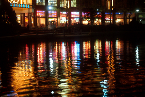 Looking directly at the lights of the Cambridgeside Galleria, one's overall impression is that of unabashed commercialism. The lights are softened on the water, however. The bright colors blend with each other and with the darker tones of the water to create a bright watercolor effect. |