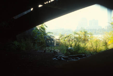 Homeless people have long sought refuge along the Charles. In the late 1800s, the City of Cambridge was motivated to create a seawall and plan an upscale residential district along the river in part because of the colony of poor people living on the tidal flats. |