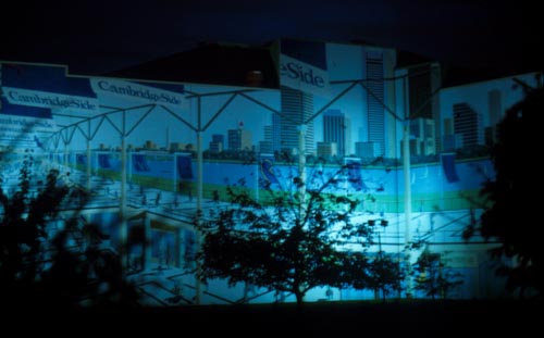 A mural adorns an outside wall of the Cambridgeside Galleria, a new use along the river.